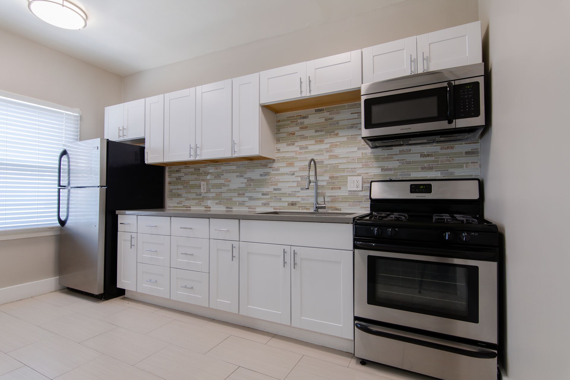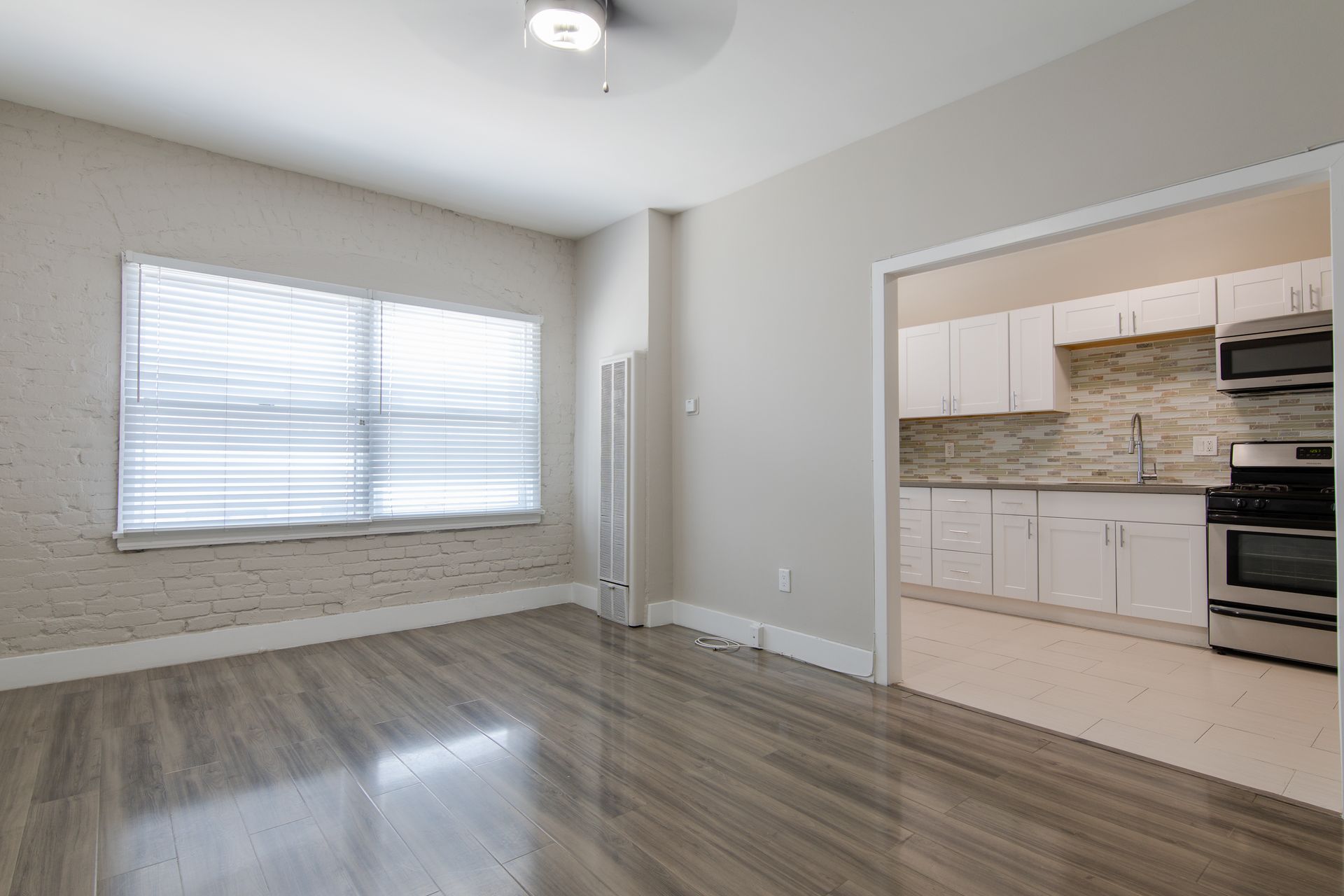 This bright apartment includes a large living room, spacious dining area, gas stove/oven, fridge for rent, garbage disposal and ac unit.